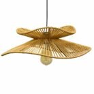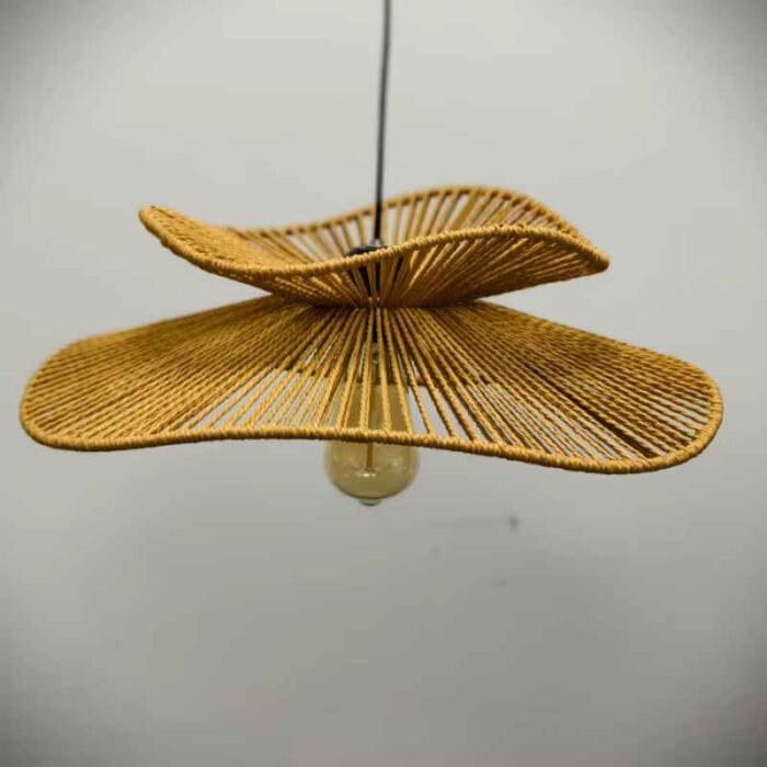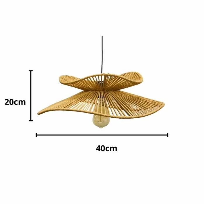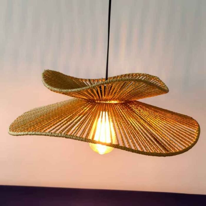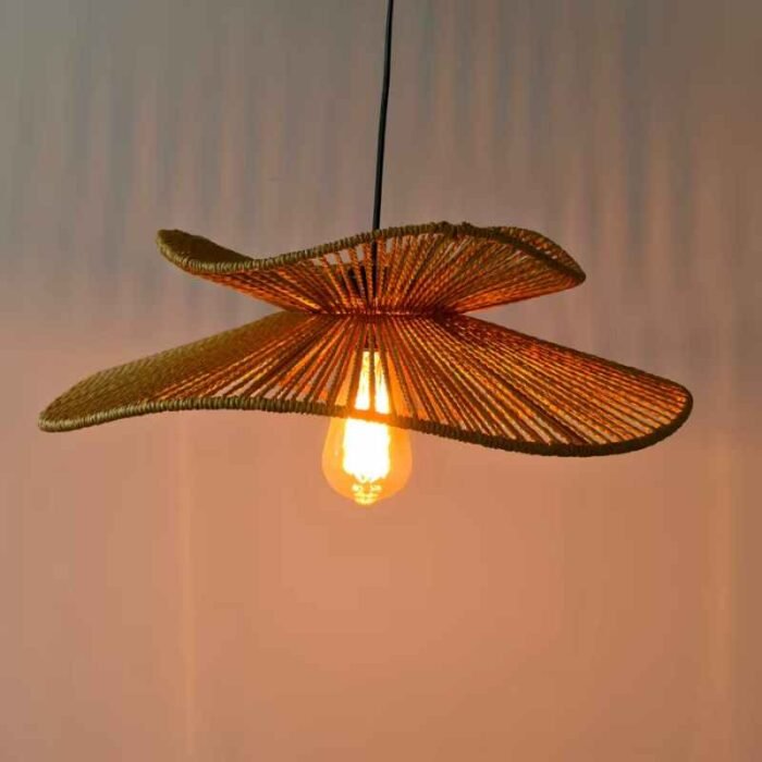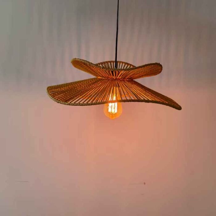 Diseño único Hecho de ratán natural alrededor de un marco de hierro, esta lámpara de araña tiene forma de sombrero de paja y proyecta un hermoso patrón en la pared por la noche cuando la luz brilla a través de la pantalla de ratán.