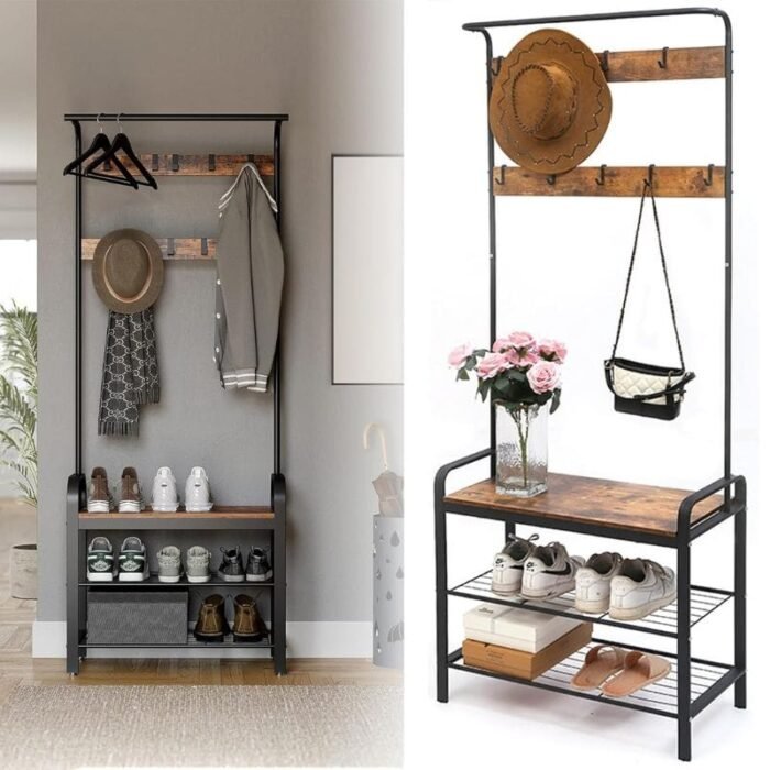 - 【Perchero 4 en 1】Este mueble de recibidor de entrada combina barras para colgar, ganchos, banco zapatero y zapateros para satisfacer todas tus necesidades, desde organizar ropa y pertenencias hasta sentarte y poner tus zapatos, aprovechando al máximo tu espacio.